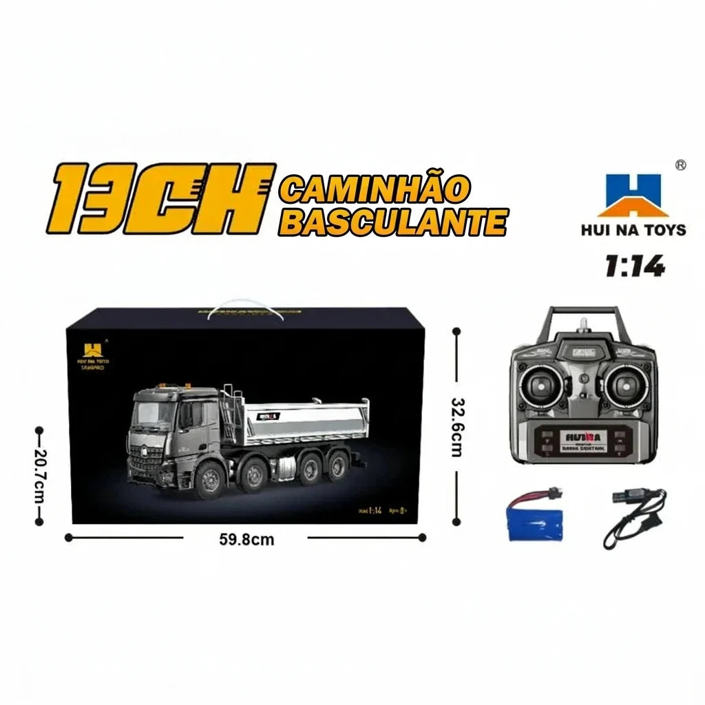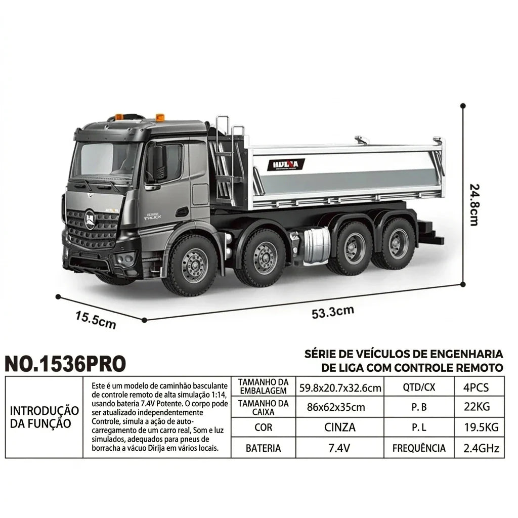 - Caminhão basculante Huina 1536 1:14 modelo pronto para usar, com caçamba funcional para carregar até 4,5 kg e detalhes inspirados em caminhões de obra reais.