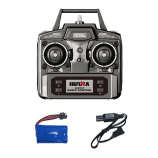 - Controle remoto 2.4G transmissor com múltiplos comandos que permitem dirigir, manobrar e acionar a caçamba a distância de cerca de 25 metros.